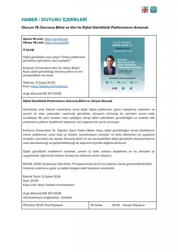 Fakültemiz Yazılım Mühendisliği Bölümü Dr. Öğr. Üyesi Hatice BÜBER KAYA, dijital gönüllülüğün temel özelliklerini; online platformlar, sanal ekip içi iletişim, koordinasyon süreçleri ve farklı ülkelerden iyi uygulama örnekleri üzerinden ele alacak. Davranış bilimi ve veri perspektifiyle dijital gönüllülük ekosistemlerinin nasıl okunabileceği ve geliştirilebileceği de kapsamlı biçimde değerlendirilecek. Dijital gönüllülük modellerini anlamak, çevrim içi katkı yollarını keşfetmek ve bu alandaki iyi uygulamaları öğrenmek isteyen herkesi bu webinara davet ediyoruz. Etkinlik, 2026 Uluslararası Gönüllüler Yılı kapsamında çevrim içi webinar olarak gerçekleştirilecektir. Herkesin katılımına açıktır ve katılım belgesi dahil tamamen ücretsizdir.